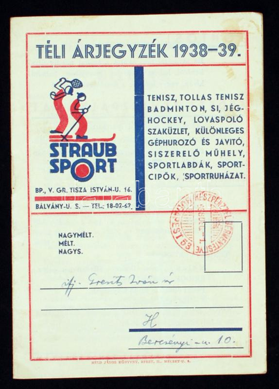 1938-39 Straub Sport, Téli árjegyzék, 16 oldal 17x12cm https://www.darabanth.com/de/227-Fernauktion/227.0/Andere-Sammelgebiete/Drucksachen~200312/1938-39-Straub-Sport-Teli-arjegyzek-16-oldal-17x12cm~II1006974