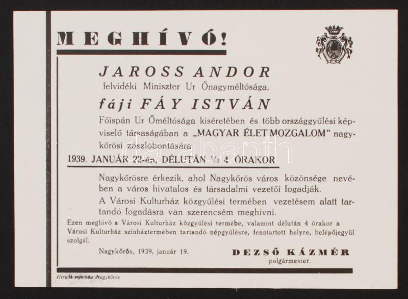 Beschreibung: 1939 Nagykőrös, Meghívó Jaross Andor felvidéki miniszter és Fáy István kíséretében zajló "Magyar Élet Mozgalom" zászlóbontására