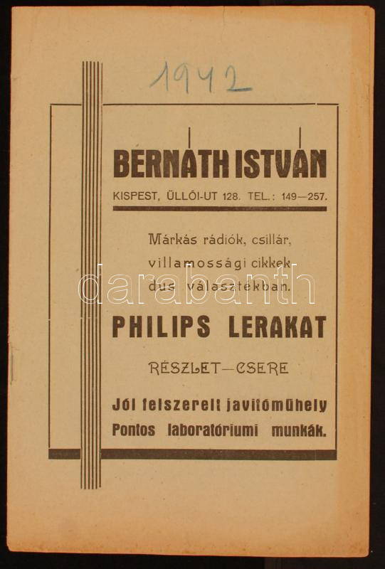 1942 Kispest, Bernáth István Philips lerakata, márkás rádiók, csilláro... https://www.darabanth.com/de/227-Fernauktion/227.0/Andere-Sammelgebiete/Drucksachen~200312/1942-Kispest-Bernath-Istvan-Philips-lerakata-markas-radiok-csillarok-villamossagi-cikkek~II1007092