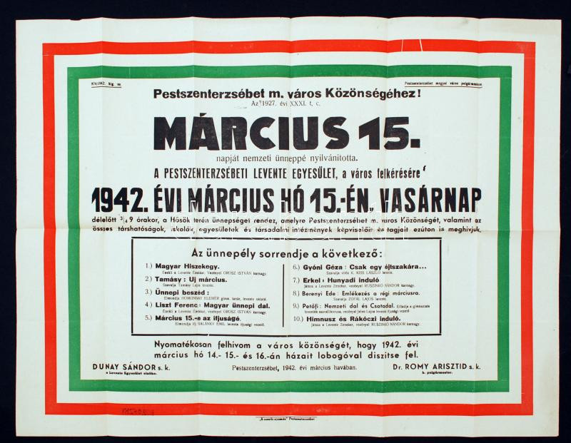 Beschreibung: 1942 Pesterzsébet, Meghívó plakát a Pestszenterzsébeti Levente Egyesület által rendezett március 15-i ünnepségre, 62x48 cm