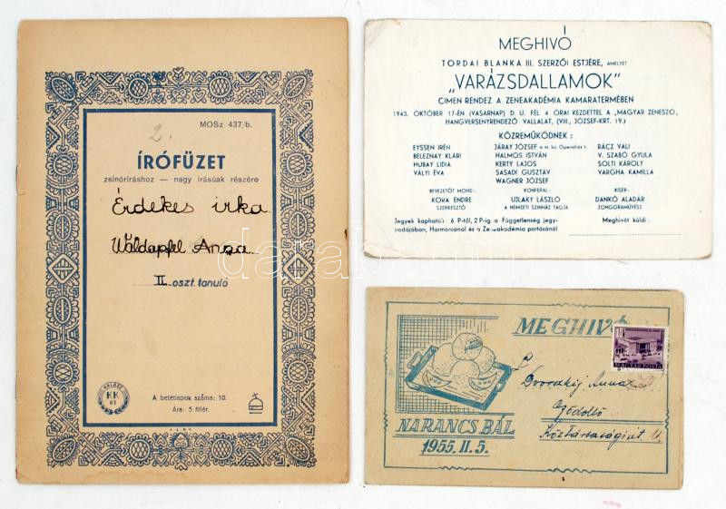 Beschreibung: 1943-1955 2 db meghívó (Meghívó Tordai Blanka "Varázsdallamok" című szerzői estjére, illetve a Narancs bálba), 1 db iskolai füzet