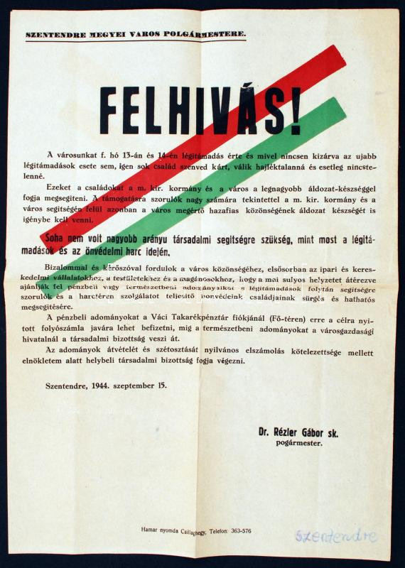 Beschreibung: 1944 Szentendre, A polgármester által kiadott felhívás a légitámadásban károsultak megsegítésére, 30x42 cm