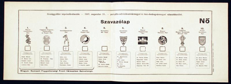 1947 Az országgyűlési képviselőválasztás női szavazólapja a Pest-Pilis-Solt-Kiskun és Bács-Bodrog vármegyei választókerületben, rajta a Magyar Nemzeti Függetlenségi Front Választási Szövetségével