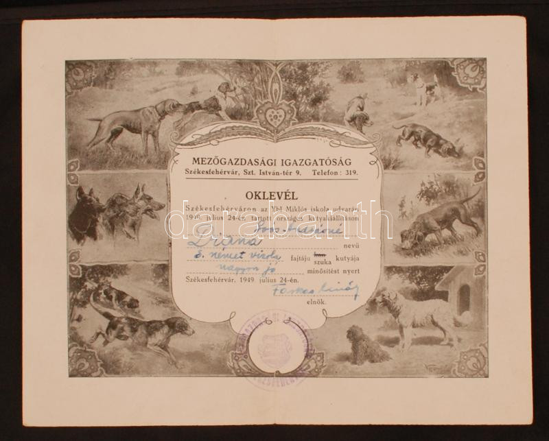 Beschreibung: 1949 Székesfehérvár, A Mezőgazdasági Igazgatóság által országos kutyakiállításon adományozott oklevél