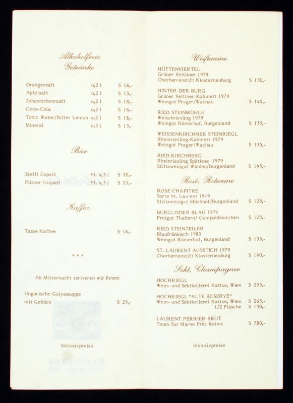 Beschreibung: 1981 Bécs, a Wiener Internationale Postwertzeichen-Ausstellung (WIPA) rendezvényének vacsorai étlapja német, részben francia nyelven