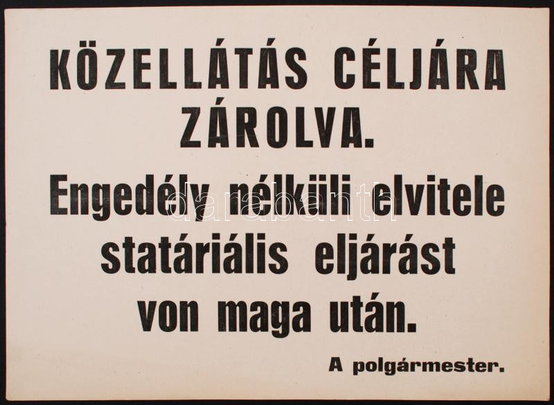 Beschreibung: "Közellátás céljára zárolva. Engedély nélküli elvitele statáriális eljárást von maga után. A polgármester" feliratú papír plakát, 30x21 cm
