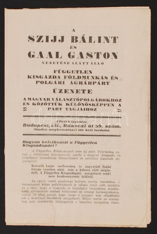 cca 1930 A Független Kisgazda Földmunkás és Polgári Agrárpárt a magyar... https://www.darabanth.com/de/227-Fernauktion/227.0/Andere-Sammelgebiete/Drucksachen~200312/cca-1930-A-Fuggetlen-Kisgazda-Foldmunkas-es-Polgari-Agrarpart-a-magyar-valasztopolgarokhoz~II1012018