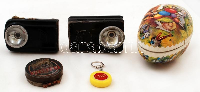 Beschreibung: 1 db Sopianae fém díszdoboz, benne Verseny cipőpasztás doboz, festett kartonpapír meglepetéstojás, kulcstartó és 2 db retró zseblámpa