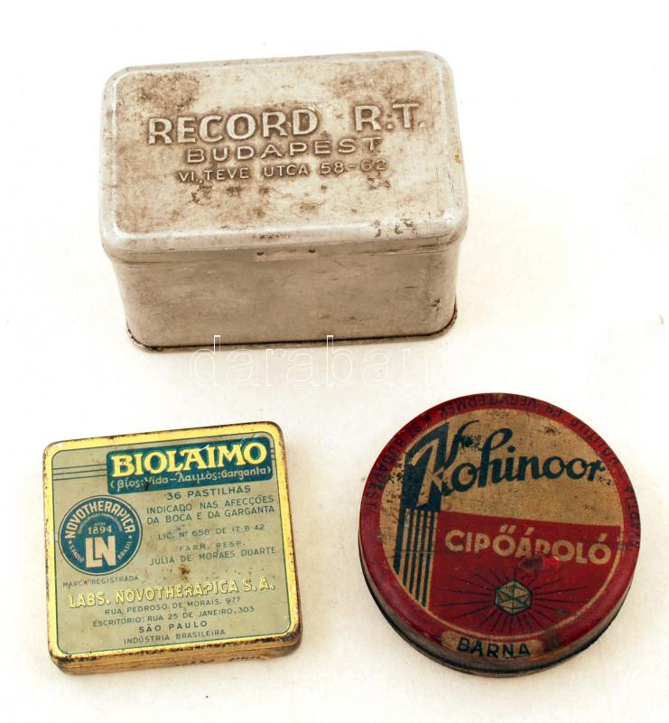 3 db régi fém doboz: Biolaimo, Record Rt. Budapest, Kohinoor cipőápoló https://www.darabanth.com/de/227-Fernauktion/227.0/Andere-Sammelgebiete/Flohmarkt~200333/3-db-regi-fem-doboz-Biolaimo-Record-Rt-Budapest-Kohinoor-cipoapolo~II1004689