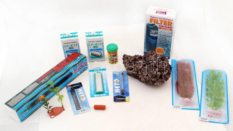 Nagy akvárium tétel: 1 db fűtő + 1 db belső szűrő + 2 db pumpa + 3 db műanyag vízinövény + 2 db hőmérő + 2 db porlasztó + 1 db Panzi Lemezes díszhaltáp + 1 db akváriumi dísznek való nagyméretű lávakő