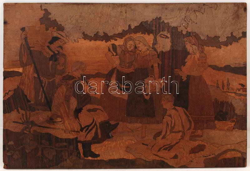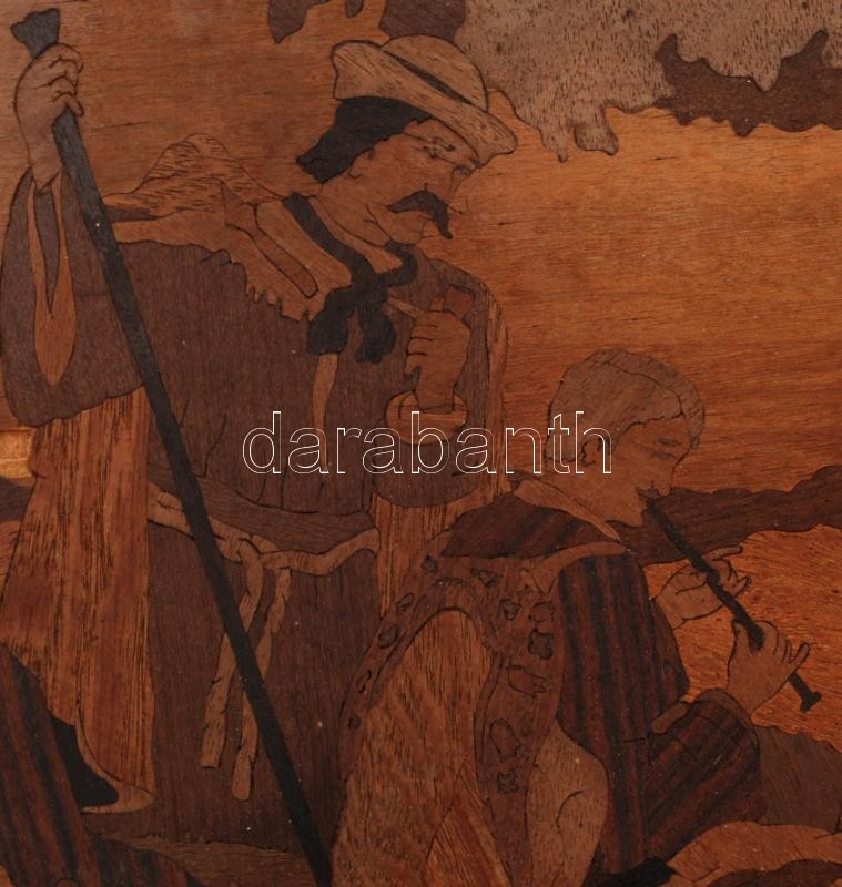 Beschreibung: Olvashatatlan jelzéssel: Furulyaszó a pusztában, fa intarzia, kis sérülésekkel, 45×31 cm