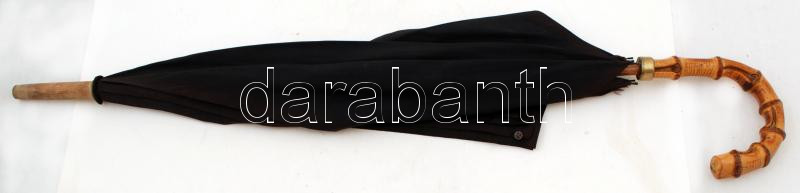 Beschreibung: Régi fanyelű, fémszerkezetes fekete esernyő, szövete több helyen lyukas, működőképes állapotban, h: 87 cm