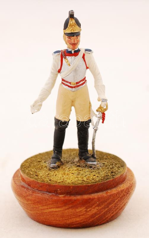 Beschreibung: Régi festett ólomkatona, fa talapzattal, m: 8 cm