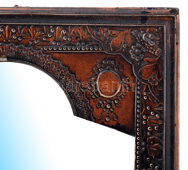 Beschreibung: Régi tükör, gazdagon díszített réz keretben, bársony hátlappal, 23×18×1,5 cm
