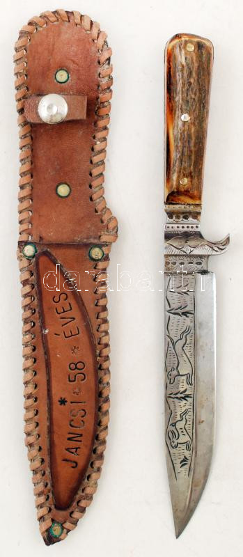 Beschreibung: Vadászjelenetes pengéjű kés, "Jancsi 58 éves" feliratú bőr tokban, pengehossz: 13,5 cm, teljes hossz: 26 cm