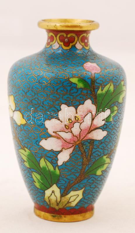 Beschreibung: Virágmintákkal díszített tűzzománc vázácska, apró kopásnyomokkal, m: 10,5 cm