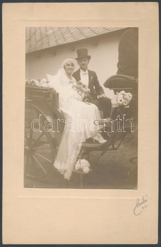 Beschreibung: 1931 Szabó Lajos (Rákoshegy): Hintóval érkezik az esküvői pár, 16,5x11,5 cm, karton 25x16 cm