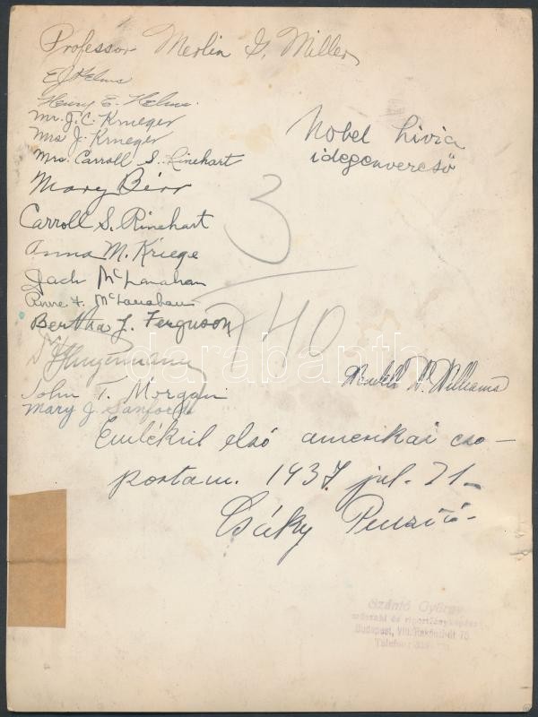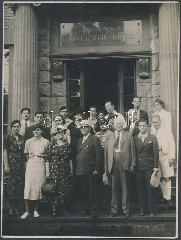 1937 Orvostörténeti lelet: az Országos Közegészségügyi Intézetbe (1927-1998) látogató amerikai szakértők csoportképe az aláírásukkal, feliratozott kép Szántó György riportfényképésztől, 24x18 cm