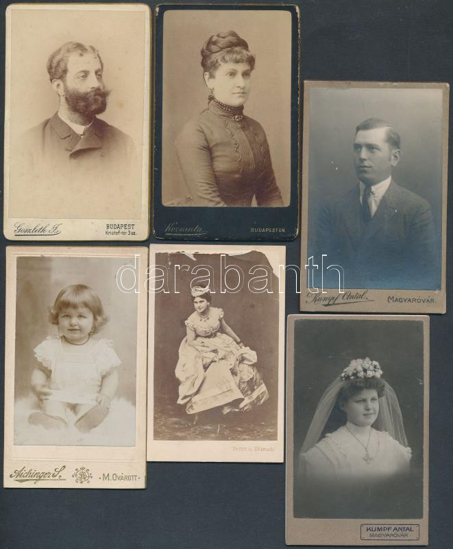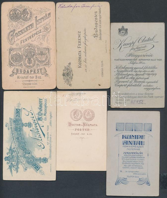 cca 1860-1890 Korabeli, keményhátú családi fotók,6db, különböző magyar műtermekből: Kummpf, Aichinger (M. Óvárott), Doctor és Kozmata (Pesten), Goszleth, Kozmata (Budapest),11x6,5cm
