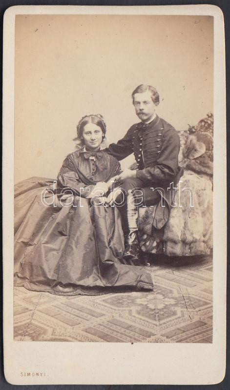 Beschreibung: cca 1865 Tahy Lajos és neje gróf Wartensleben Ilona Simonyi pesti fényirdájában, vizitkártya méretű, keményhátú, feliratozott fénykép, 10,5x6 cm