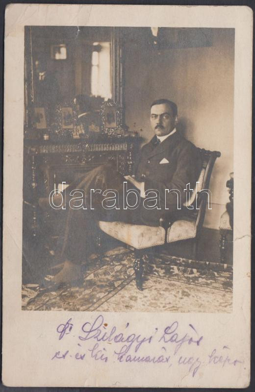 cca 1910 Dr. Szilágyi Lajos császári és királyi kamarás portréja egy fotólapon, további kutatást igényel, hogy azonos-e Bihar vármegye főispánjával (1918-1920) kis lapszéli szakadás, 14x9 cm