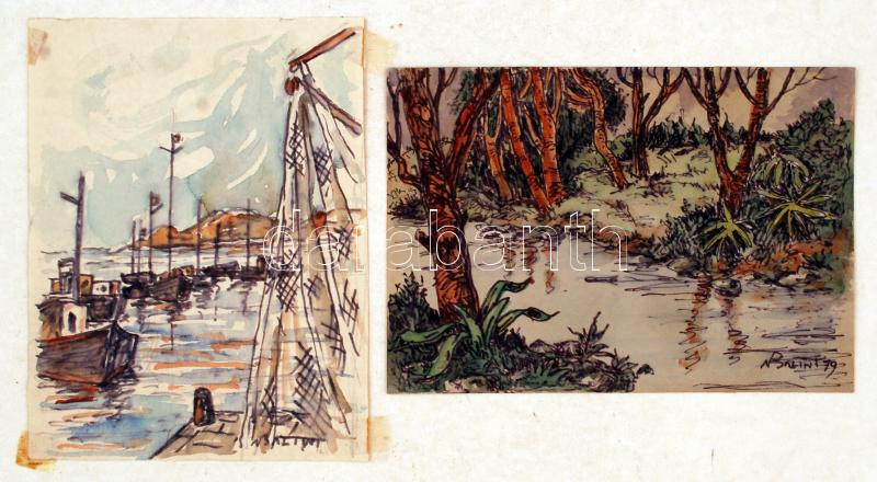 Beschreibung: Bálint jelzéssel: Kikötő. Vegyes technika, papír, 19×14,5 cm, Patak part. Vegyes technika, papír, 14×20 cm (2db)