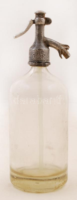 Beschreibung: Díszített fejű Goldenberg & Mark Roman márkájú Victoria 1930 szódásüveg, "DGM" jelzéssel, d: 10,5 cm, m: 31,5 cm