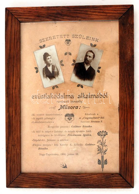 Beschreibung: 1901 Zsidó házaspár ezüstlakodalmára készült fényképes emléklap üvegezett keretben. Nagy- Tapolcsány (Topol'cany,Felvidék), 25,5x18cm
