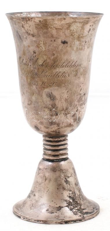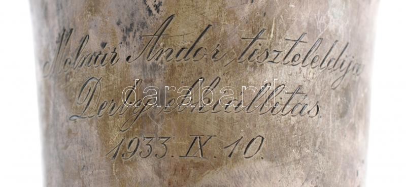 Ezüst ( Ag.) kupa "Molnár Andor tiszteletdíja Derby ebkiállítás 1933 IX.10." A legjobb airedale terrier szukanak" feliratokkal, jelzett, mesterjeggyel (KM), nettó:276 g, m:20 cm