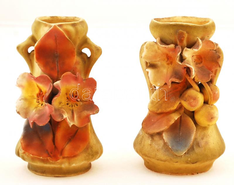 Beschreibung: 2 db kisméretű szecessziós mázas kerámia váza növényi díszítéssel, jelzés nélkül, apró kopásnyomokkal, lepattanásokkal, m: 13 cm