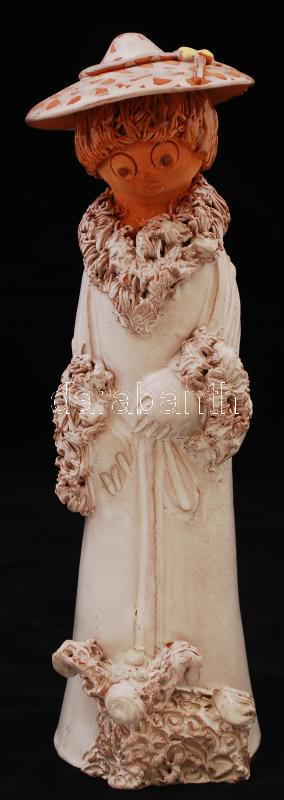 Beschreibung: Antalfiné Szente Katalin (keramikus): Kalapos hölgy. Mázas kerámia, jelzett, lepattanásokkal/