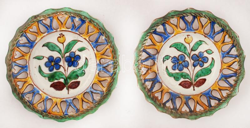 Beschreibung: Badár Balázs Mezőtúr: Áttört, kézzel festett, mázas kerámia fali tányér,2db, lepattanásokkal, 17cm