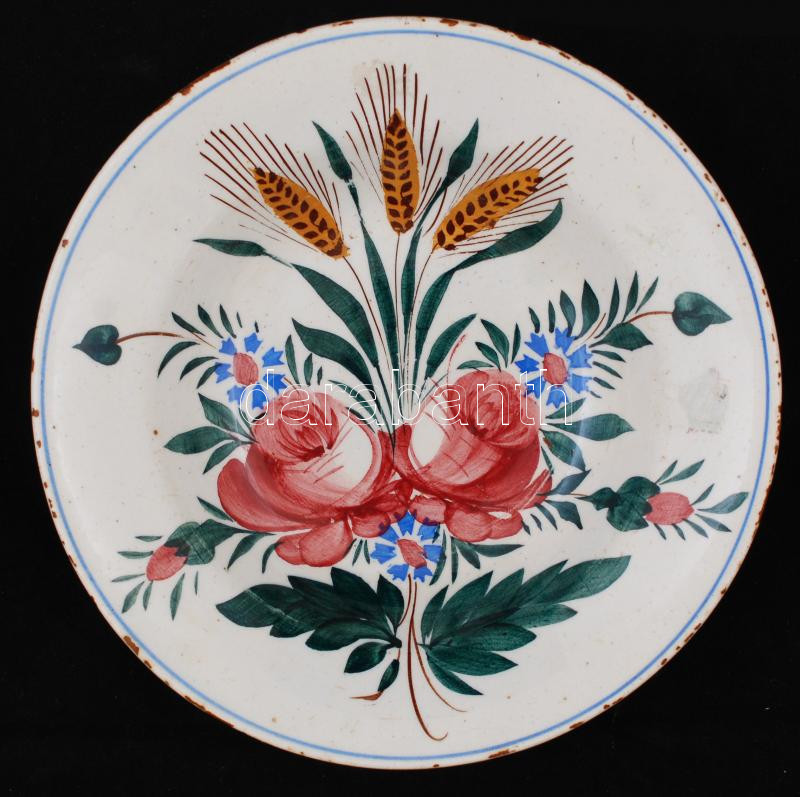 Beschreibung: Bélapátfalvi búzakalász-mintás falitányér, kézzel festett, jelzett, kopásnyomokkal, d: 23 cm
