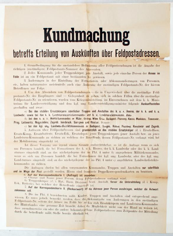 1914 Német nyelvű hirdetmény a tábori postai címekről való tájékoztatá... https://www.darabanth.com/de/227-Fernauktion/227.0/Andere-Sammelgebiete/Militaria~200310/1914-Nemet-nyelvu-hirdetmeny-a-tabori-postai-cimekrol-valo-tajekoztatassal-kapcsolatban--~II1012170