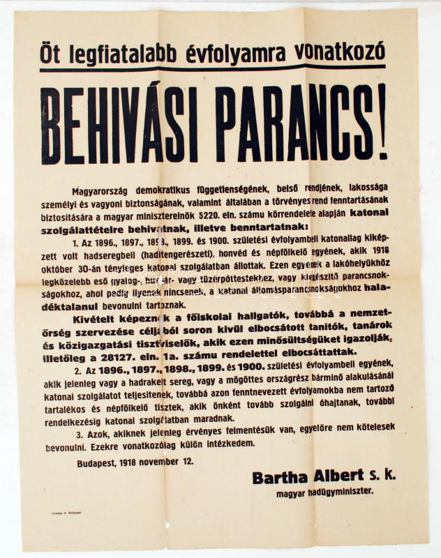 1918 Bp., Bartha Albert hadügyminiszter által kiadott behívási parancs nagyméretű plakátja, mellyel katonai szolgálattételre szólít fel minden 1896 és 1900 között született katonailag kiképzett egyént, szakadt állapotban, 64x47 cm