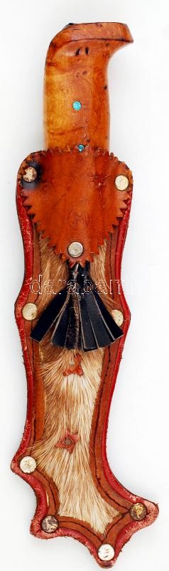 Beschreibung: J. Marttiini finn vadász kés, szén acél pengével, topolyagyökér markolattal, topáz berakással, jelzett, díszített bőr hüvelyben, h:20,5 cm
