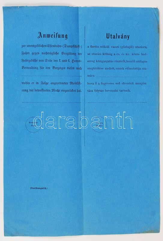 cca 1914 Császári és királyi hadsereg részére 3 db kitöltetlen utazási... https://www.darabanth.com/de/227-Fernauktion/227.0/Andere-Sammelgebiete/Militaria~200310/cca-1914-Csaszari-es-kiralyi-hadsereg-reszere-3-db-kitoltetlen-utazasi-utalvany-vasutra-e~II948613