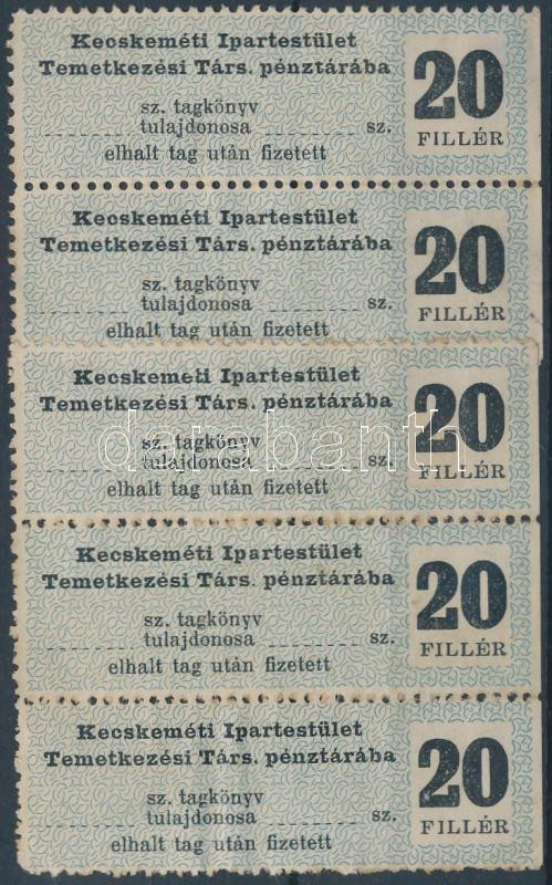 Beschreibung: ~1920 Kecskeméti Ipartestület Temetk. Társ. által kibocsátott 20f segélybélyeg ötöscsíkban
