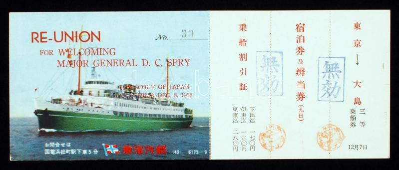 1956 Reunion for welcoming Major General D. C: Spry. Boy scout of Japan, at Oshima dec. 8. 1956. Japán nyelvű belépőjegy Daniel Charles Spry (1913-1989) kanadai vezérőrnagy fogadására