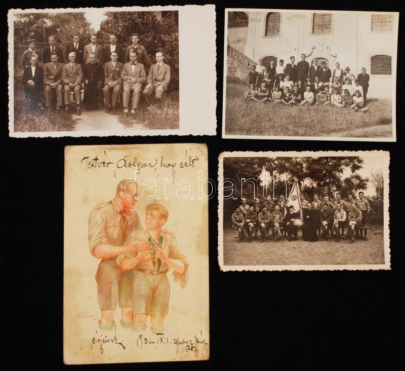 Beschreibung: cca 1932 3 db cserkészcsapatokról készült fotó, 1 db cserkész képeslap "Testvér dolgozz,h célt érjünk" felirattal