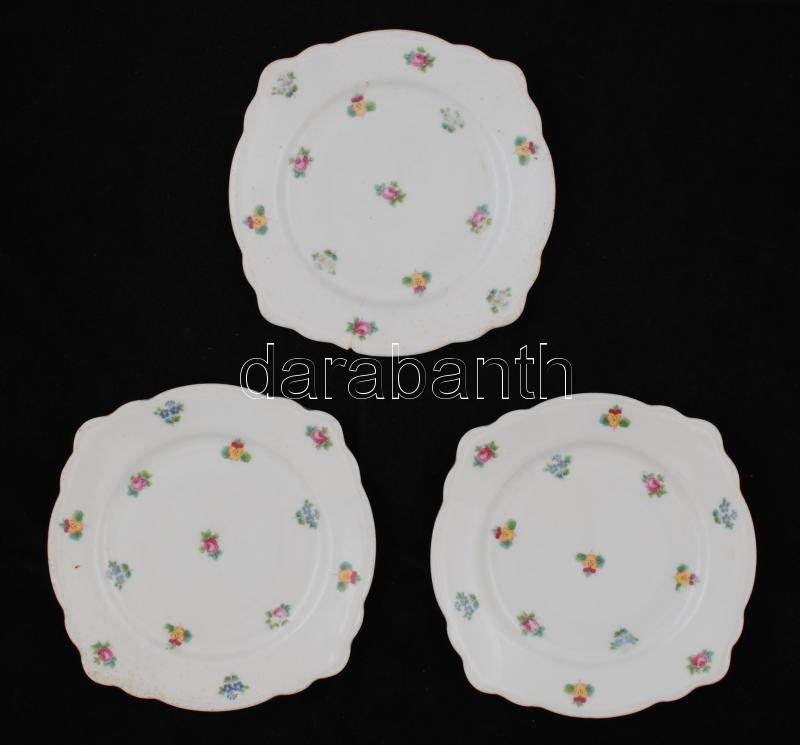 4 db virágmintás Union K csehszlovák porcelán kistányér, kézzel festett, jelzett, kopásnyomokkal, lepattanásokkal, az egyiken kis repedéssel, d: 15-16,5 cm