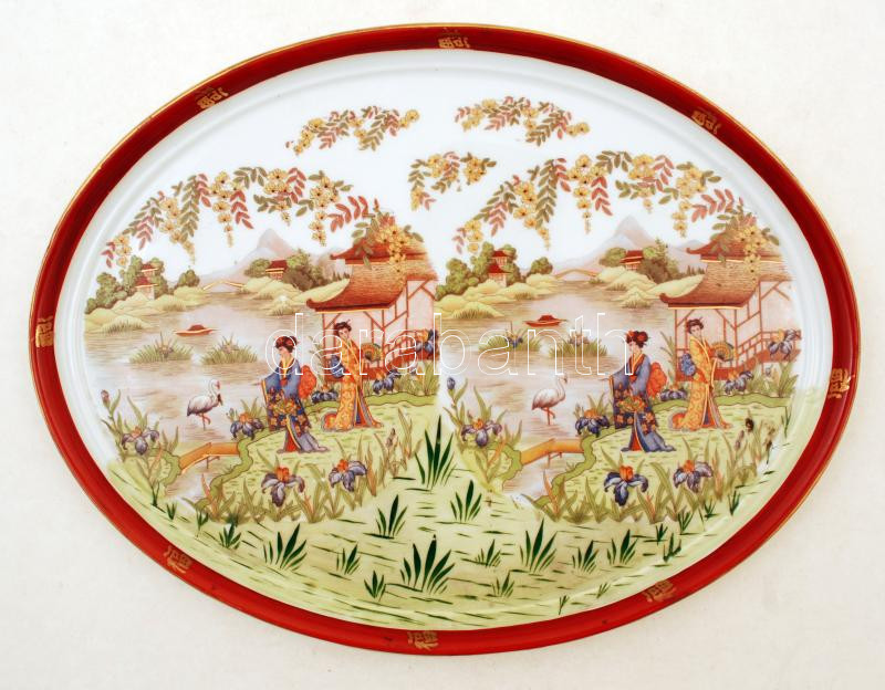 Beschreibung: Kínai életképes porcelán tál, matricás (hibával), "GHL" jelzéssel, apró kopásnyomokkal, 43×32,5 cm
