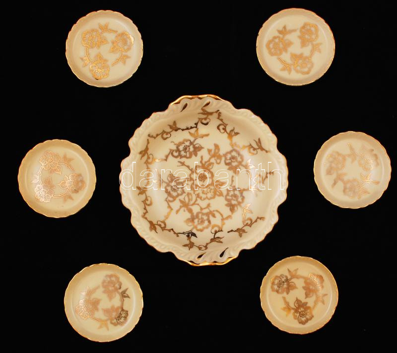 Beschreibung: Oscar Schlegelmilch porcelán kistányér készlet, 6 db, hibátlan, jelzett, d: 7,5 cm, 1 db kínálótál, d: 16 cm