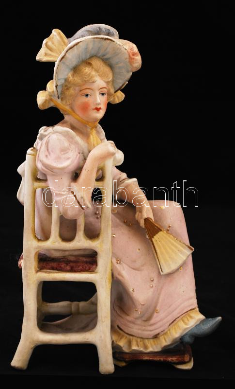 Beschreibung: Ülő hölgy legyezővel, festett bisquit porcelán, jelzés nélkül, apró kopásnyomokkal, repedéssel, m: 22 cm