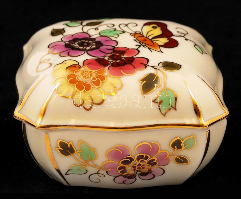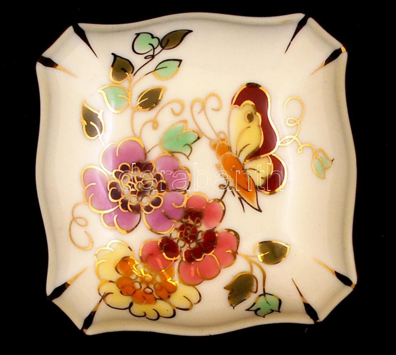 Beschreibung: Zsolnay pillangó mintás ékszeres doboz, kézzel festett, hibátlan, jelzett, 7,5×7,5 cm