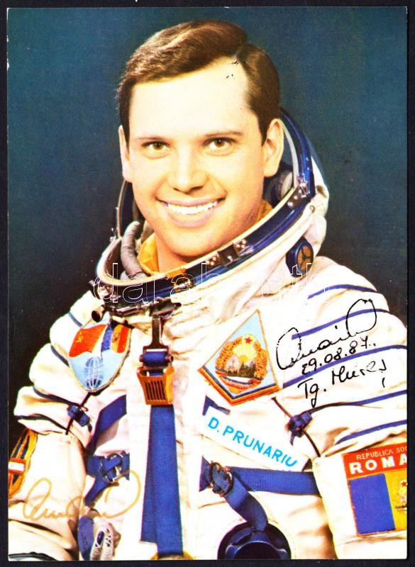 Dumitru Dorin Prunariu (1952-), az első és egyetlen román űrhajós aláírása az őt ábrázoló képeslapon /