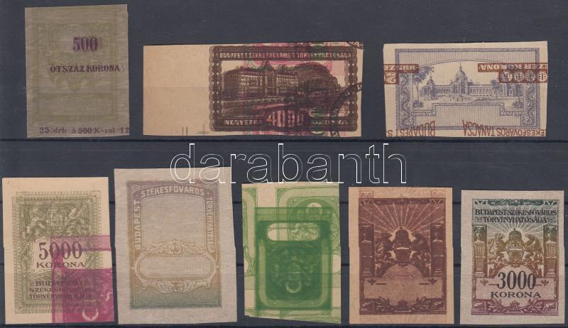 1904-1924 8 db Budapest Székesfővárosi illetékbélyeg próbanyomata (ket... https://www.darabanth.com/de/227-Fernauktion/227.0/Andere-Sammelgebiete/Stempelmarken~200339/1904-1924-8-db-Budapest-Szekesfovarosi-illetekbelyeg-probanyomata-kettosnyomat-forditott-f~II1004972