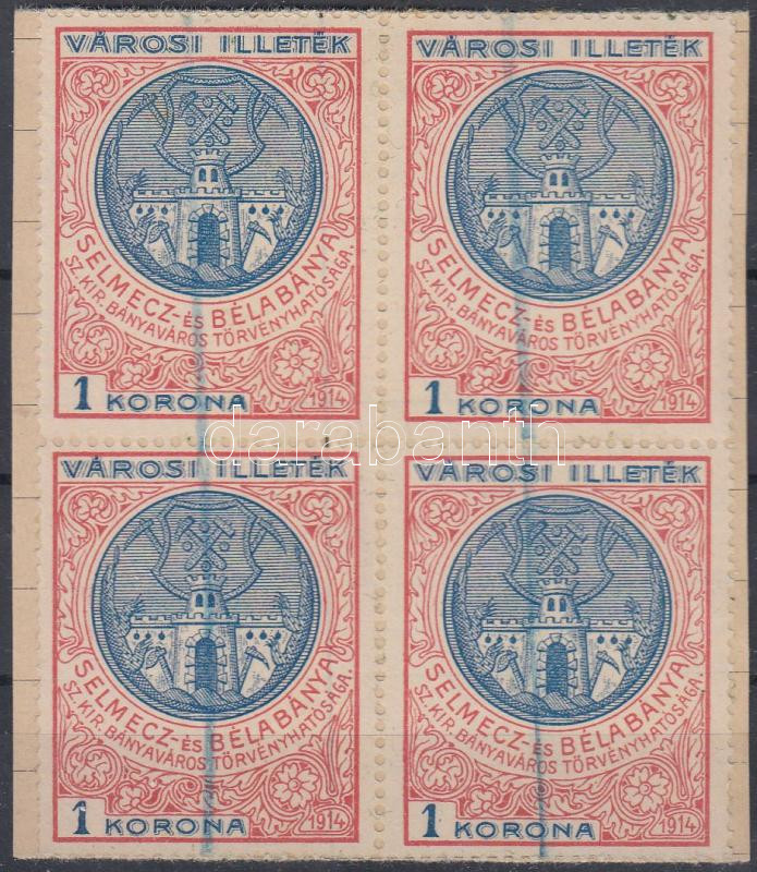 1914 Selmecz- és Bélabánya 1K városi illetékbélyeg négyestömb kivágáso... https://www.darabanth.com/de/227-Fernauktion/227.0/Andere-Sammelgebiete/Stempelmarken~200339/1914-Selmecz-es-Belabanya-1K-varosi-illetekbelyeg-negyestomb-kivagason~II1011990