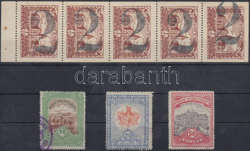 Beschreibung: 3 db szegedi illetékbélyeg + mezőtúri 5-ös csík (23.750)