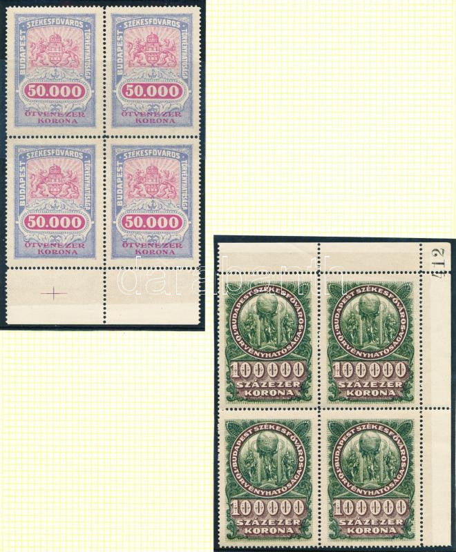 Budapest Székesfőváros 50.000K ívszéli négyestömb + 100000K ívsarki né... https://www.darabanth.com/de/227-Fernauktion/227.0/Andere-Sammelgebiete/Stempelmarken~200339/Budapest-Szekesfovaros-50000K-ivszeli-negyestomb-plus-100000K-ivsarki-negyestomb-sorszammal~II954314